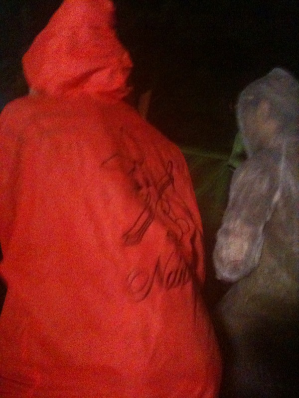 *たまに出会うスキー関係者と乾杯する。写真のイカしたポンチョを着ているのはブラボースキー炊ける氏。透湿性ゼロらしいポンチョの持ち主は、湯沢ローカル、高橋知也。