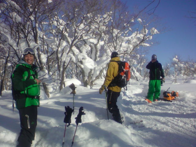 コンディションがいい日はみんなが集まります。ニセコでガイドをする瀬戸直人さん、山頂で会い同じルート。下まで下ると、児玉毅さん、SOS札幌の三上大紀さんたちに遭遇! プライベートで滑りにきてました。こんな日はみ~んな笑顔。同じ楽しみを共有できるのも、この遊びの醍醐味ですね
